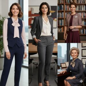 シンプルなブラウスに、質の良い大ぶりなブローチを添えたり、上質なスカーフを巻いたりするなど、一点豪華なアクセントを加えるのがおすすめです。また、首元や手首など、年齢が出やすい部分をカバーしつつ美しく見せるカッティングのデザインを選ぶことで、優雅で隙のないプロフェッショナルな佇まいを演出できます。